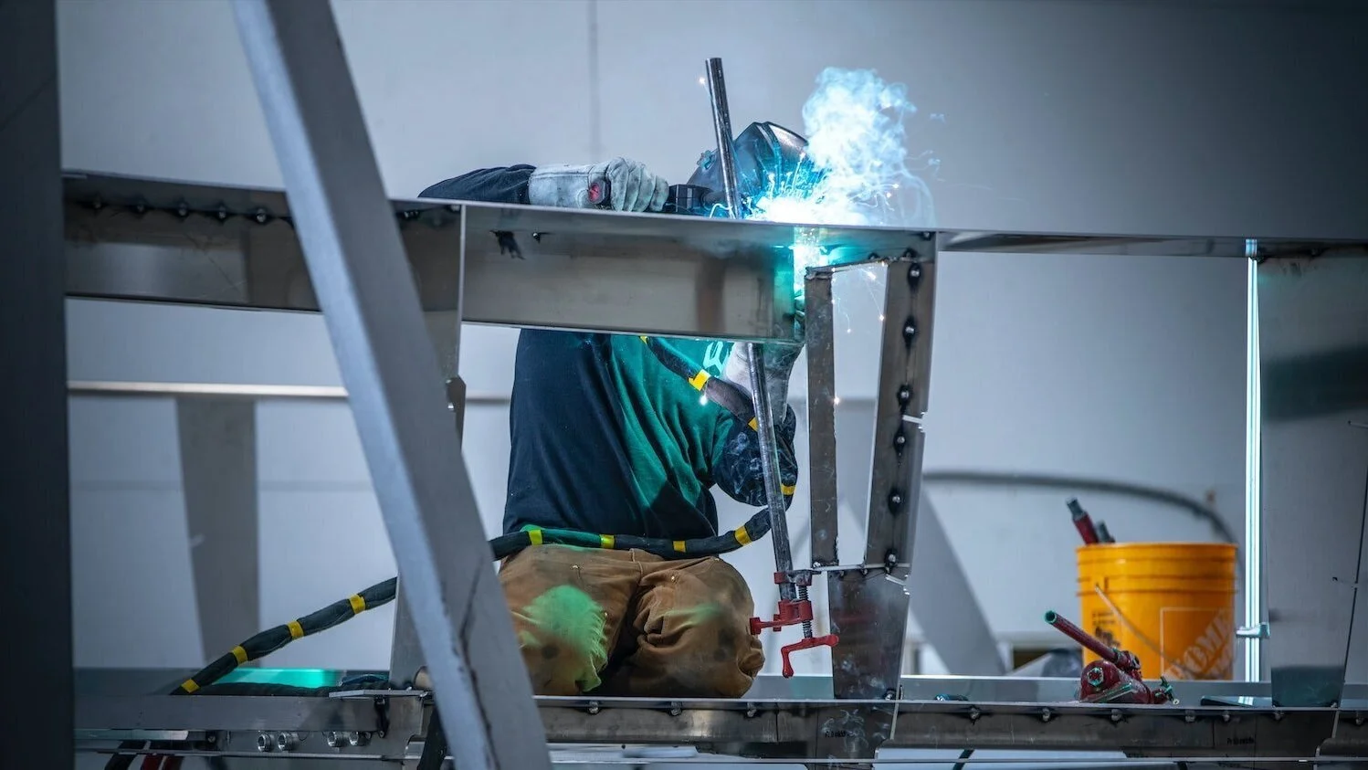 If you are at all familiar with aluminum boat construction, you would expect the hull to be built upside down to start. Most boats are built this way because it’s more convenient to join the plate together and weld out the seams before rotating and inserting the structure. This is only possible with fully developable hull surfaces as there is very little force required to join the plate. This makes an easy-to-build boat, but ultimately sacrifices ride quality.